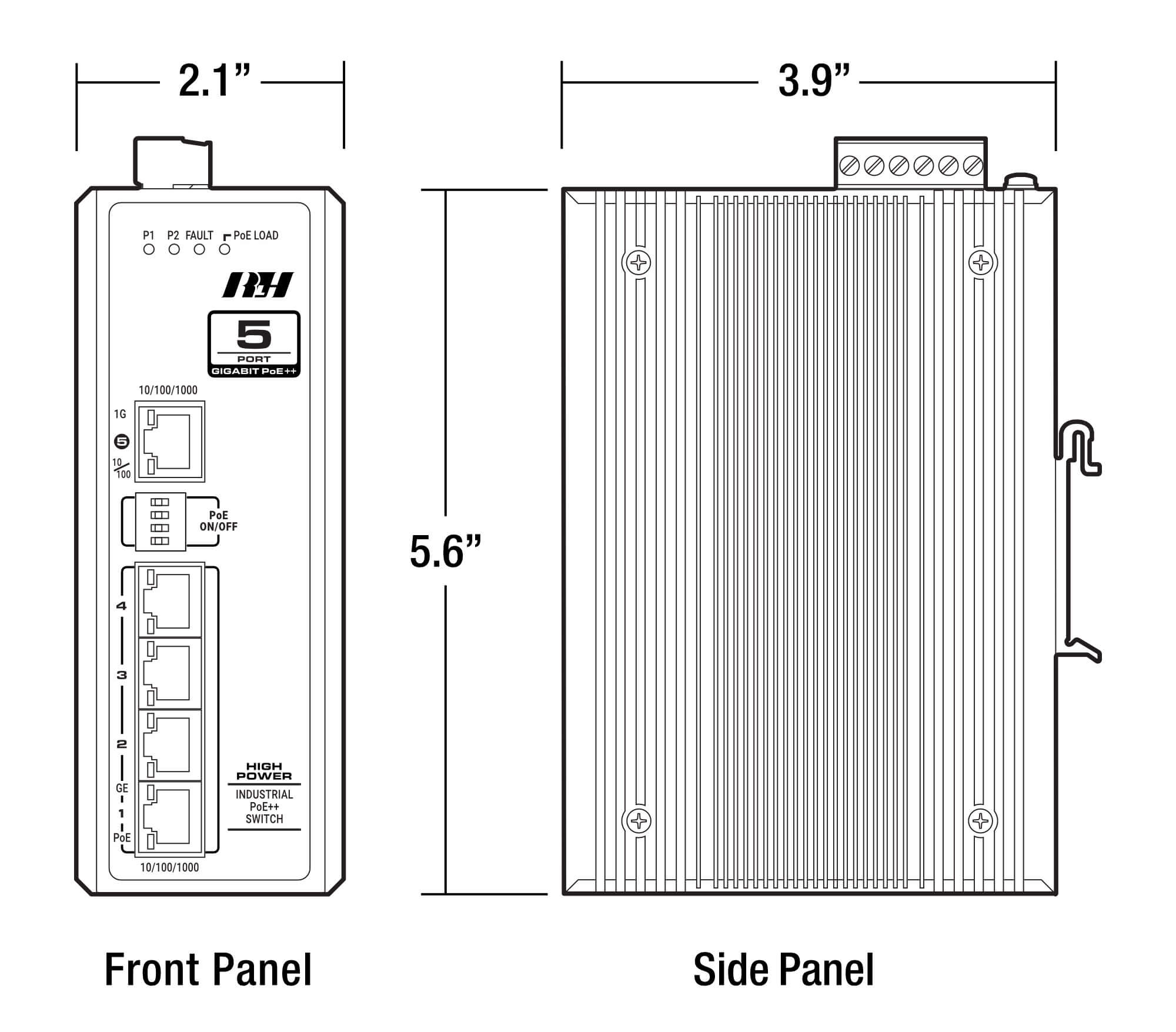 RLH hardened industrial Ethernet switches are engineered to provide reliable network performance in harsh environments. The Industrial 5 Port Gigabit Ultra PoE++ Switch provides Gigabit data transfer and can supply four Powered Devices (PDs) with up to PoE++-rated power. Four (4) of its five (5) copper Ethernet ports can supply PoE++.